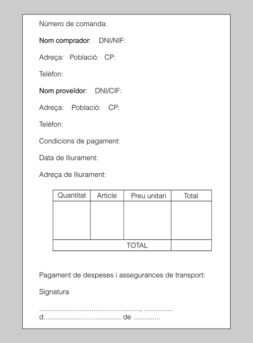 En la figura teniu un exemple de model de comanda. La comanda no és un model oficial i, per tant, l’empresa pot utilitzar el model que cregui més adient en funció de les característiques de l’entorn, les mercaderies que compri i de les seves necessitats.