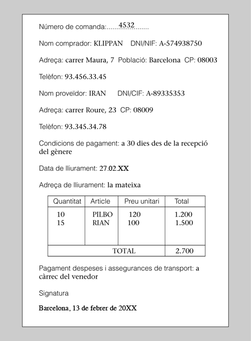 El pagament es farà a 30 dies. Els costos de transport són a càrrec del venedor. Es lliurarà a l’adreça que consti com a domicili social de l’empresa. Data de la comanda: 13.02.XX. Data de lliurament: 27.02.XX. Número de comanda: 4532.