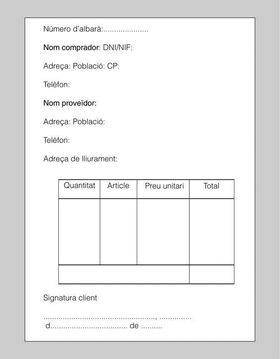 En la figura teniu un exemple de model d’albarà. No és un model oficial i, en conseqüència, l’empresa pot utilitzar el que cregui més adient en funció de les característiques de les mercaderies que ven.