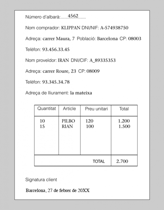 L’empresa KLIPPAN rep de l’empresa IRAN la comanda, que coincideix exactament amb el que havia demanat; el proveïdor lliura també l’albarà (figura).