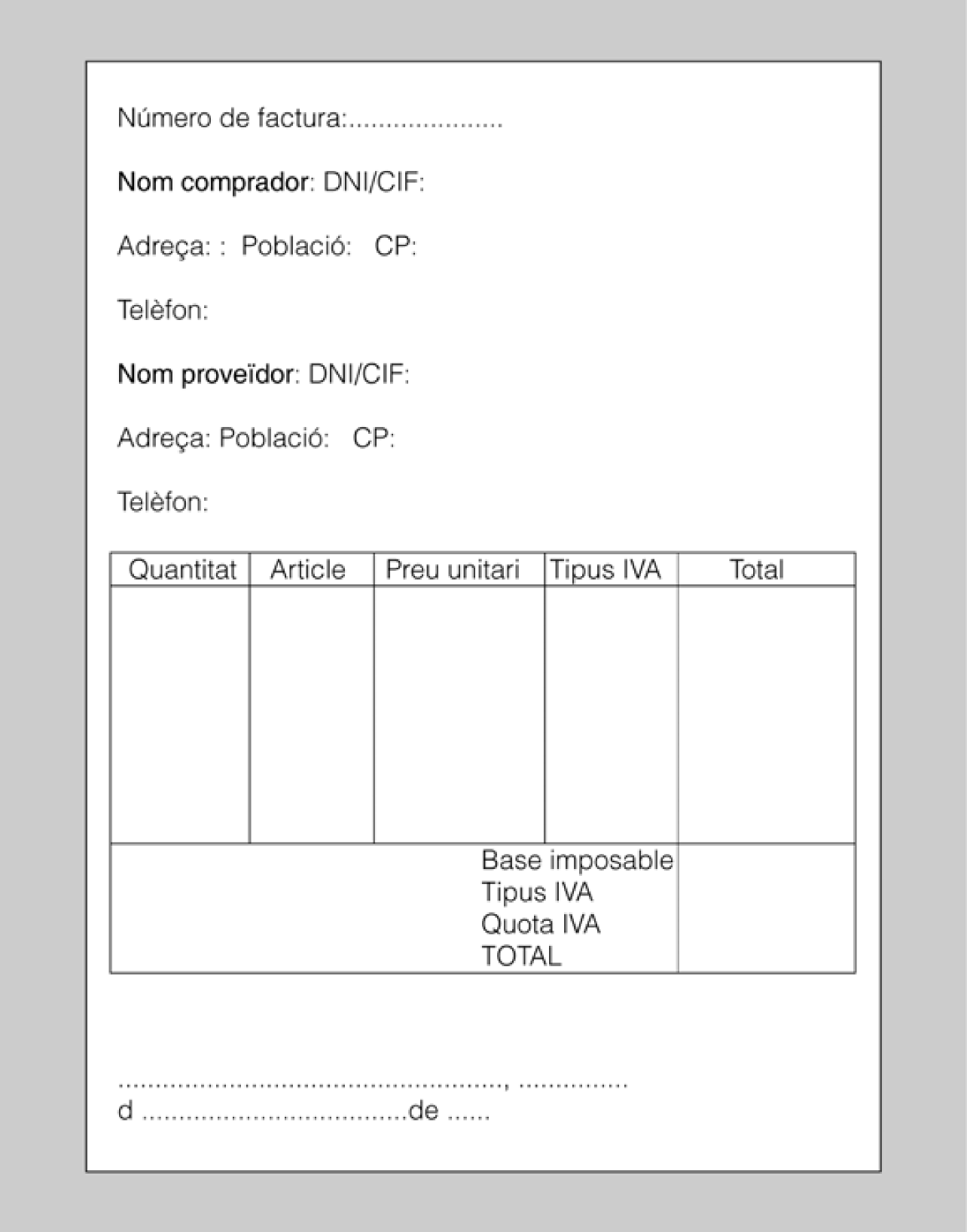 El model de factura és lliure, sempre que hi constin les dades mínimes (vegeu-ne un model en la figura).