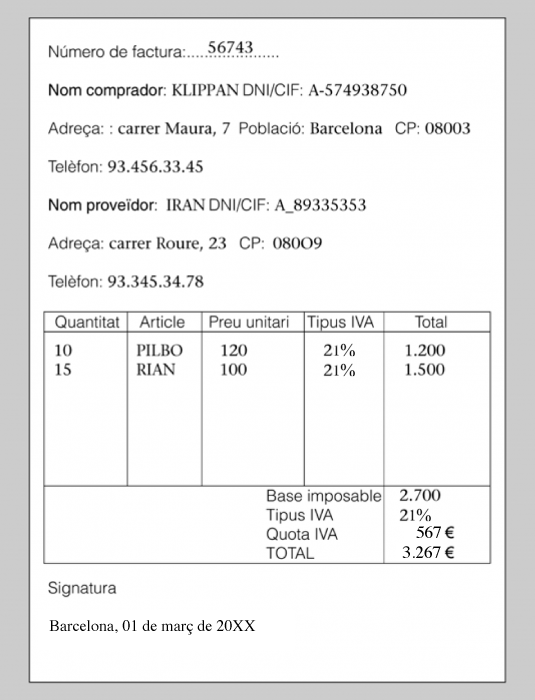 KLIPPAN, després de rebre els articles, rep la factura del seu proveïdor IRAN (figura). Totes les condicions pactades són respectades. Data de la factura: 01.03.10. Número de la factura: 56743.