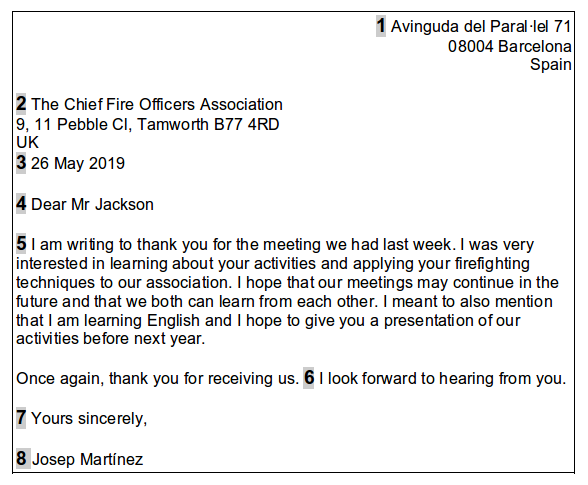 Apart from the guidelines indicated, in formal letters you must use some conventional words and expressions, as well as some obligatory elements, such as the address, the date and the signature. Here is an example of a formal letter (see the image below). The purpose of the letter is to thank the Chief Fire Officers Association for a meeting:
