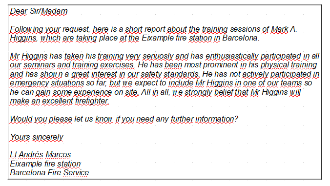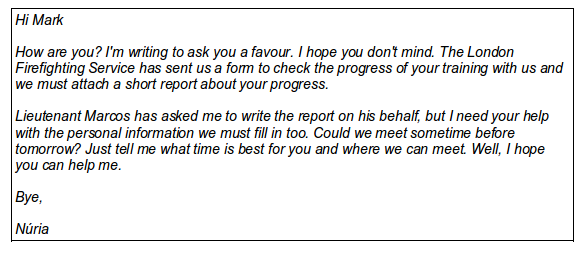 The London Fire Service has asked the fire station in Barcelona to send a short report about the progress of Mark Higgins’ training. Núria’s superior, Lieutenant Andrés Marco, does not speak English, so he has asked her to write the email on his behalf. Before sending the email, she writes to Mark Higgins to help her with the report.