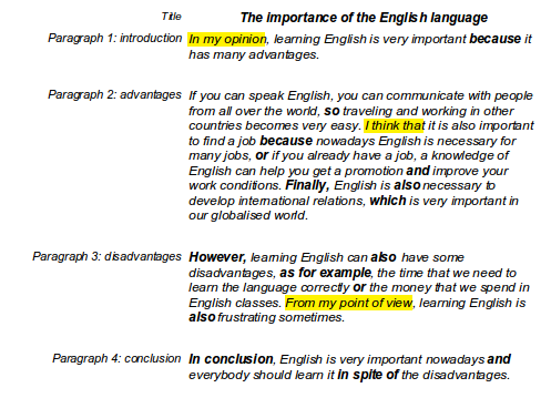 - Appropriate vocabulary: use the right words to express your ideas (use a dictionary if you have any doubts) and the specific words and expressions used for giving opinions (see them in yellow in the example text below).