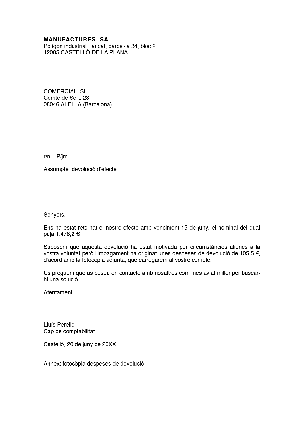 - Annex. Hem d’escriure la paraula annex en la part inferior esquerra de la carta quan hi adjuntem documents, com ara lletres de canvi, fotocòpies d’impagaments, fullets, catàlegs, etc.