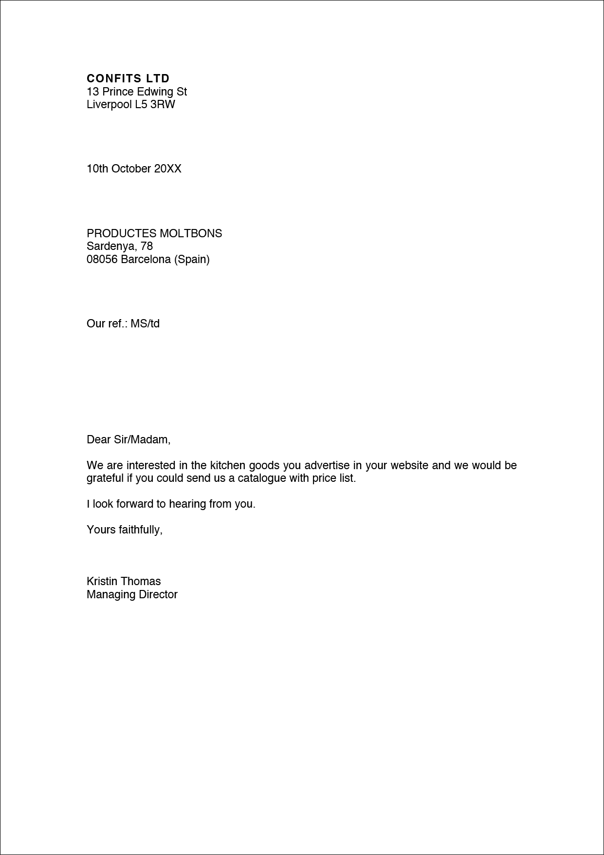 A l’hora d’elaborar aquest tipus de comunicació en llengua anglesa, cal tenir en compte que el grau de formalitat és força alt, ja que no coneixeu la persona que rebrà la carta. Per aquest motiu cal acostumar-se a utilitzar expressions com ara Dear Sir o Madam per a la salutació, i Yours faithfully per al comiat. També us heu de presentar (I would like to introduce myself. My name is…) i especificar dins del cos de la carta, com a referència, com us heu adreçat a l’empresa receptora si és la primera vegada que us hi poseu en contacte (We are interested in the products you advertise in your website). Cal especificar clarament què demaneu, ja que, altrament, semblaria una carta de presentació en comptes d’una carta de sol·licitud d’informació (figura).