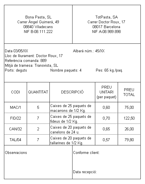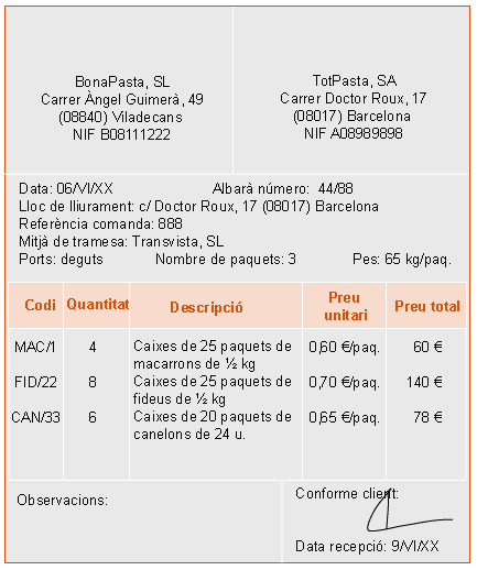 L’empresa TotPasta, SA amb NIF A08989898 i domicili al carrer Doctor Roux, 17 de Barcelona (08017), tramet la comanda de mercaderies núm. 888 a l’empresa BonaPasta, SL amb NIF B08111222, domiciliada al carrer Àngel Guimerà, 49 de Viladecans (08840), per sol·licitar: