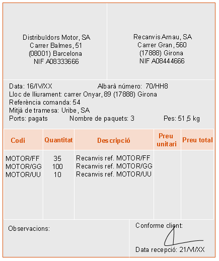 L’empresa Recanvis Arnau, SA amb NIF A08444666 i domicili al carrer Gran, 560 de Girona (17888) tramet la comanda de mercaderies núm. 54 a l’empresa Distribuïdors Motor, SA amb NIF A08333666, domiciliada al carrer Balmes, 51 de Barcelona (08001), per sol·licitar: