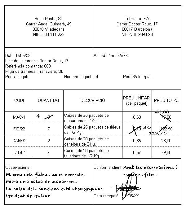 L’objectiu d’aquesta activitat és corregir un albarà que conté anomalies i saber l’actuació correcta en aquests casos.