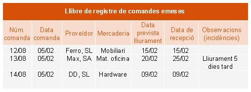L’objectiu d’aquesta activitat és conèixer el Llibre registre de comandes emeses, identificar les seves parts i omplir-lo correctament.