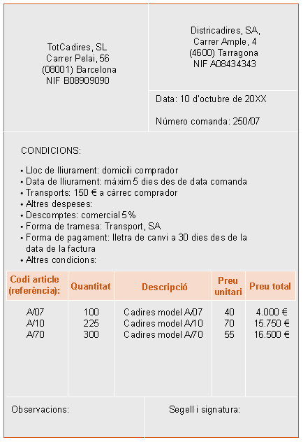 L’empresa TotCadires, SL amb NIF B08909090 i domicili al carrer de Pelai, 56 de Barcelona (08001) realitza el dia 10 d’octubre 20XX una comanda de mercaderies a l’empresa Districadires, SA, amb NIF A08434343 i domicili al carrer Ample 4 de Tarragona (46000). La mercaderia sol·licitada és la següent: