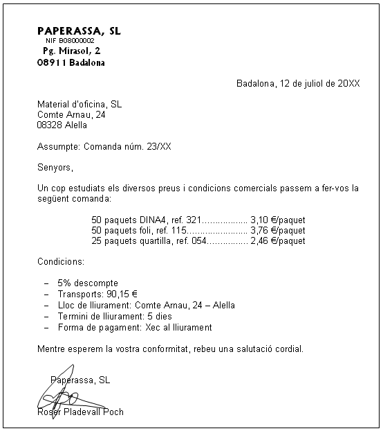 L’objectiu d’aquesta activitat és elaborar una carta de comanda amb les dades que es proposen.