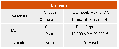L’empresa Automòbils Rovira, SA realitza un contracte de compravenda per escrit mitjançant el qual es compromet a lliurar a l’empresa Transports Casals, SL dues furgonetes per un import de 12.500 euros cadascuna.