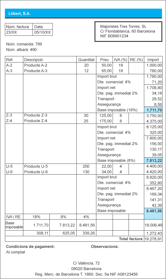 Confeccioneu amb data 05/10/XX la factura núm. 23/XX, sabent que correspon a la comanda núm. 789 i a l’albarà 490 i que les despeses de transport i d’assegurança es reparteixen proporcionalment a l’import net dels productes.