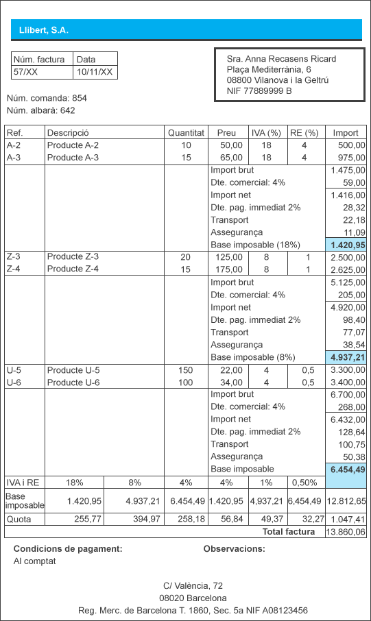 L’empresa Llibert, SA, amb domicili al carrer de València, 72 de Barcelona i NIF A08123456, ha venut a la comerciant detallista Sra. Anna Recasens Ricard, sotmesa al règim especial d’IVA del recàrrec d’equivalència, amb domicili a la plaça Mediterrània, 6 de Vilanova i la Geltrú (08800) i NIF 77888999 B els articles següents: