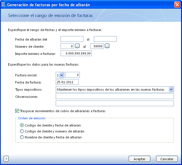 - Per ordenar els albarans en les factures hi ha diferents possibilitats en la zona Orden de emisión (vegeu la figura).