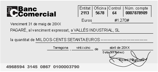 Per a fer el pagament el Sr. Ricard emet un pagaré amb data de venciment 31/05/XX domiciliat en el compte núm. 2123 5678 64 0007878909 que té obert en el Banc Comercial.