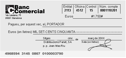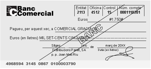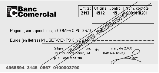 - Ompliu el document de pagament suposant que el xec s’emet per a ser cobrat únicament en un compte bancari obert a la Caixa de Catalunya.