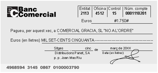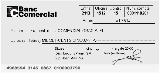 El pagament s’efectua mitjançant xec emès el dia 05/03/XX.