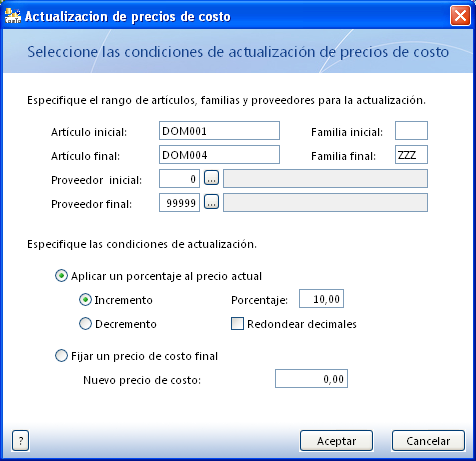 - Actualitzeu els preus de cost dels dominis que han experimentat un increment del 10%: Almacén\Actualización de precios de costo. Accepteu una sola vegada, ja que per cada acceptació fa un nou càlcul sobre els últims preus que troba.