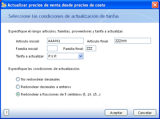 - Actualitzeu els PVP a partir dels preus de cost de tots els productes, arrodonint els imports a fraccions de 5 cèntims: Almacén\Actualizar PVP desde el precio de costo.