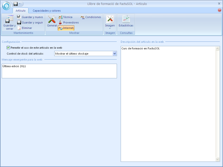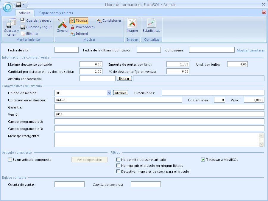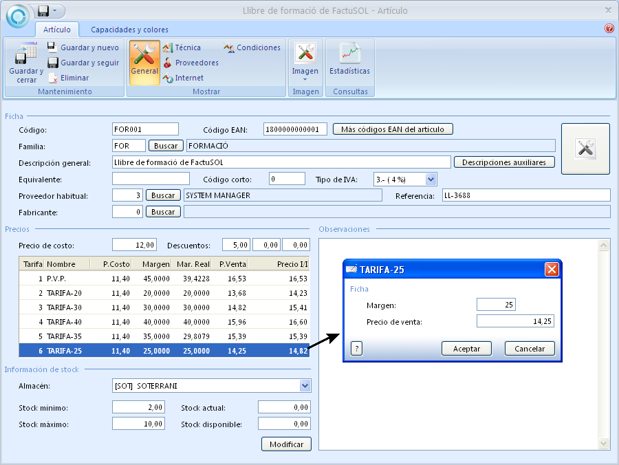 - Consulteu la fitxa del llibre de formació FactuSOL des d’Almacén\Artículos, accediu a la finestra Condiciones i observeu que hi ha la mateixa condició especial anterior.
