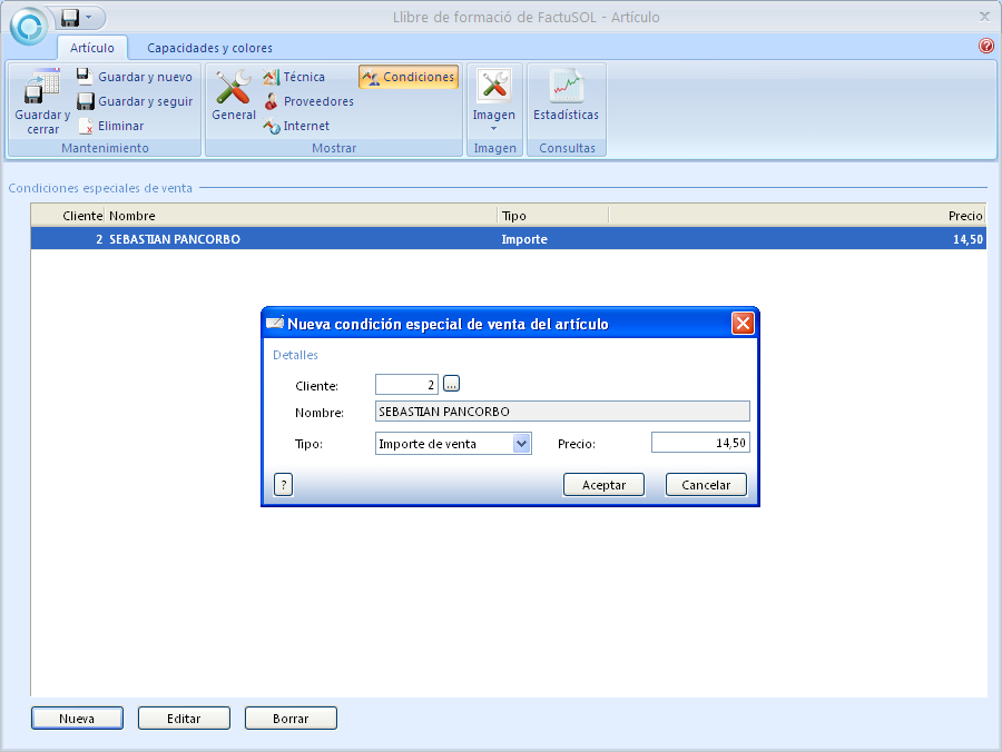 - Observeu les condicions especials des de l’opció Condiciones especiales: entre altres, hi ha el client Sebastián Pancorbo, amb un preu especial de 14,50 €/unitat per al llibre de formació de FactuSOL que es va introduir des de la fitxa de l’article.