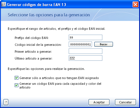 - Genereu els codis de barres per a la gestió interna dels articles, de tots els que no en disposin, de manera automàtica i aleatòria, amb el prefix 99: Artículos\EAN-13. Després observeu el resultat: els que no tenien codi de barres ara ja en tenen i comencen per 99.