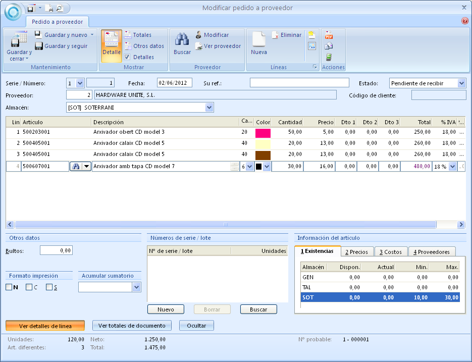 - Introduïu la data, el proveïdor, el magatzem i el número de la nova factura rebuda. Per exemple: 28/06/12 – 2 – Soterrani – 1333.
