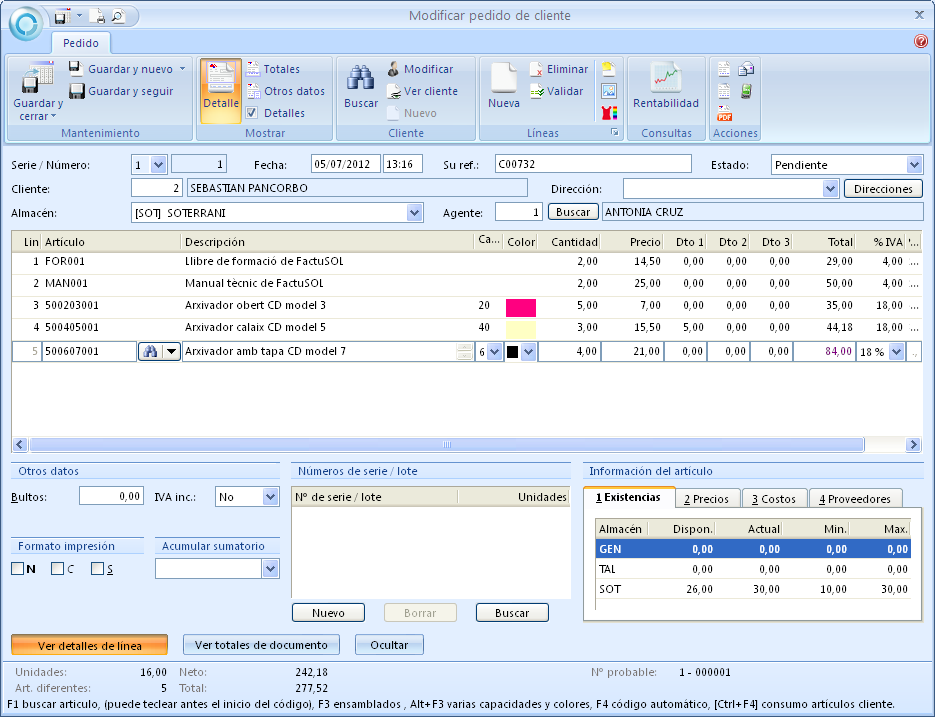 - Feu doble clic a cada article, consulteu-ne les existències des de la pestanya Existencias i compareu-les amb l’inventari de compres del 30 de juny: comprovareu que els estocs actuals no han variat però sí els disponibles.