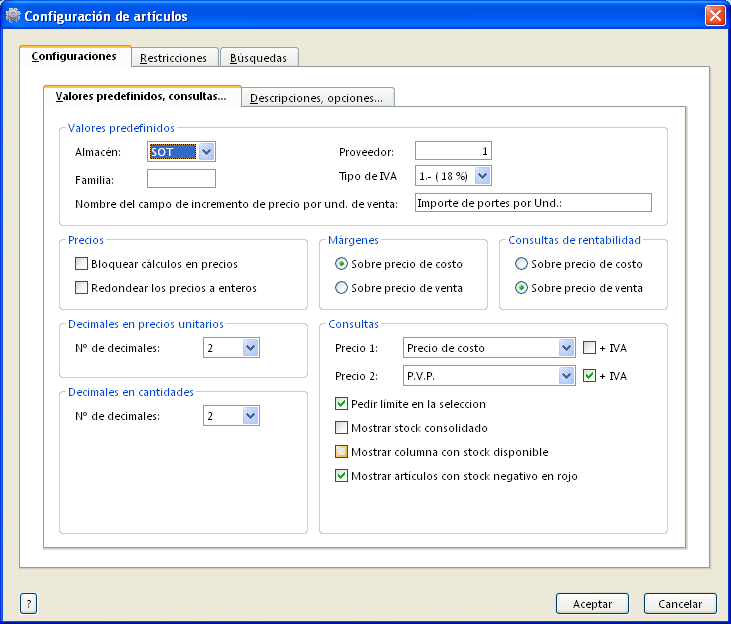 - Per predifinir el magatzem Soterrani: a la pestanya Valores predefinidos, consultas….