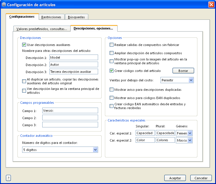 - Per fer aparèixer les noves descripcions Model i Autor, un nou camp programable amb el títol Versió i per substituir Talla i Tallas per Capacidad i Capacidades: a la pestanya Descripciones, opciones…. Després de modificar els noms Talla i Tallas, el nom Tallajes quedarà automàticament substituït per Tipos.