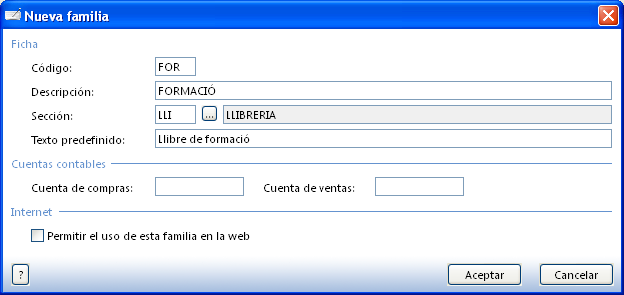 - Les tres famílies d’articles noves, cada una associada a la secció corresponent: Familias.