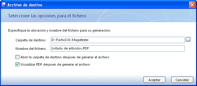 - Imprimiu la llista d’articles en PDF per conèixer els preus actuals: Almacén\Artículos\Listado\ botó Vista previa\Convertir a .PDF, indiqueu la ruta i el nom del fitxer.