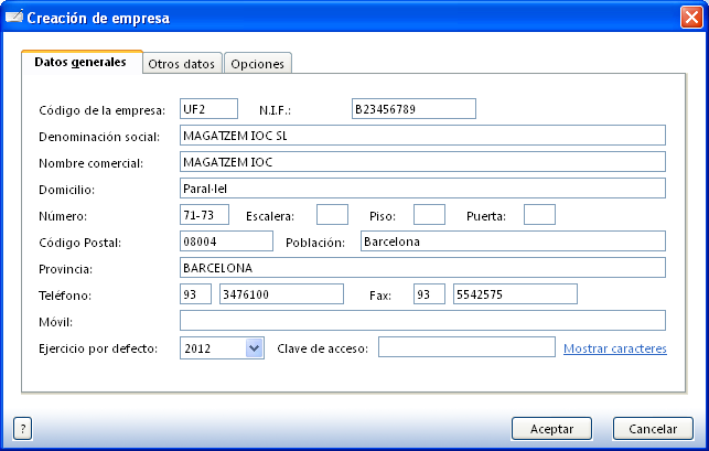 - Feu clic al botó Sistema per accedir al seu menú i seleccioneu Nueva empresa. Creeu l’empresa amb la qual treballareu, amb el codi UF2, amb el nom MAGATZEM IOC SL i l’exercici 2012 o el que vulgueu. Podeu inventar la resta de dades.