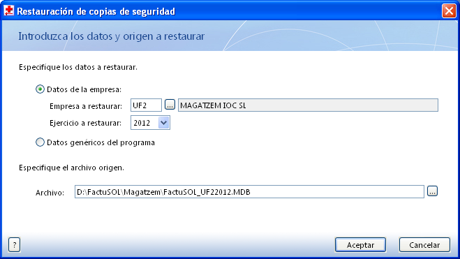 - Restaureu la còpia de seguretat de la vostra empresa de magatzem IOC per l’exercici en què heu estat treballant, o per l’exercici 2012 si heu optat per recuperar la còpia descarregada: Sistema\Seguridad\Restaurar copia de seguridad, seleccioneu l’empresa UF2 i l’exercici, indiqueu la ruta en què hi ha la còpia de seguretat i accepteu.