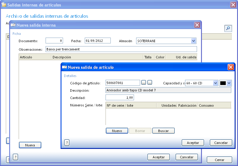 - Introduïu la data, el client i el magatzem. Per exemple: 12/08/12 – 2 – Soterrani.