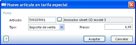 | Arxivadors oberts | 7,00 € (de la Tarifa-40 segons la fitxa de l’article) | Tarifa especial 6,00 €: no aplicada perquè a la seva fitxa de client té activada l’opció Aplicarle la tarifa especial de precios: No. |
