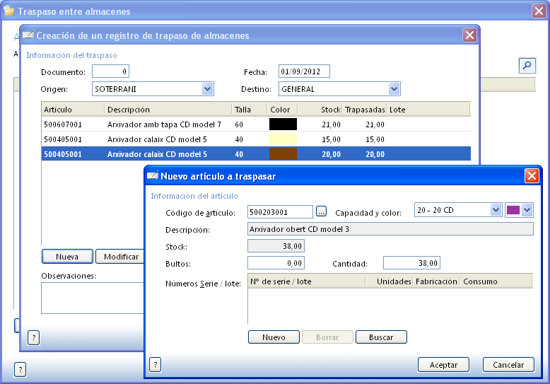 - Traspasseu la família dels arxivadors al magatzem general: Traspaso entre almacenes.