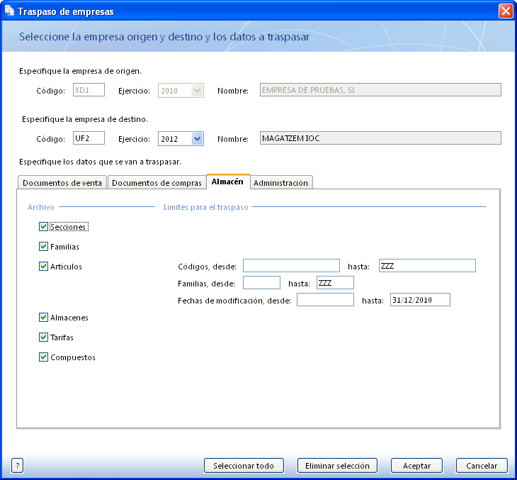 Per traspassar els fitxers des de l’empresa de proves a l’empresa de magatzem IOC, aneu a Sistema\Archivo de empresas\Traspaso de datos de la empresa. Seleccioneu l’empresa UF2 i les dades següents: