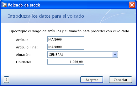 - Establiu l’estoc fictici per a la mà d’obra (codi MAN000) de 1.000 unitats, per al magatzem general: Volcado de stock. Tingueu en compte que si regenereu l’estoc, desapareixerà aquest estoc fictici.
