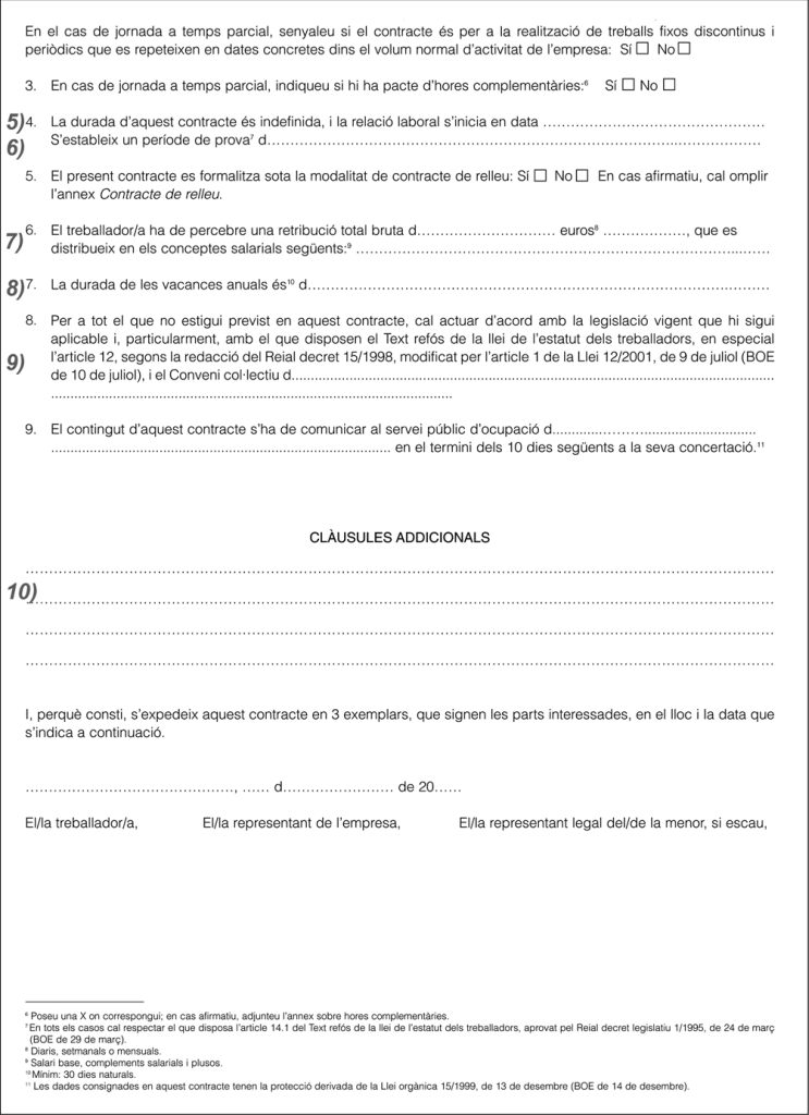 De la mateixa manera, el contracte també conté altres elements que matisen i especifiquen les condicions concretes del lloc de treball, com, per exemple, el grup professional o la categoria, la denominació del lloc de treball, la descripció de les funcions que s’han de dur a terme, la durada del contracte, la durada de la jornada laboral i l’horari, el salari i la seva composició, etc.