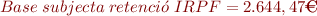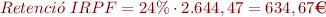 3. Càlcul de la retenció per IRPF: S’ha d’aplicar el percentatge de retenció del 24% sobre la base subjecta a IRPF. Aquesta base coincideix amb el total de les retribucions del període, ja que no hi ha cap concepte exclòs (cal tenir en compte que si l’extinció donés lloc a una indemnització, estaria exempta fins a l’import previst legalment).