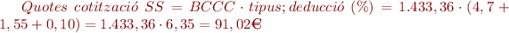 - Deduccions a la SS. Es pot calcular el total de les quotes de cotització a la SS, ja que les bases de cotització de contingències comunes i professionals són idèntiques. A més a més, no s’han fet hores extraordinàries durant el mes. Els tipus són del 4,7 % (contingències comunes), 1,55% (atur) i 0,10% (formació professional).