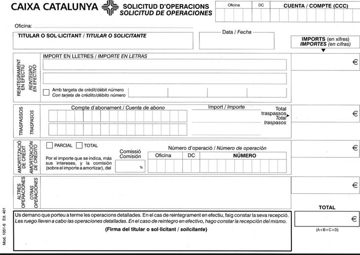 Carregar una operació en un compte bancari consisteix a registrar un càrrec o verificar una anotació en el deure del compte. En la figura podeu veure un imprès de sol·licitud d’operacions diverses.