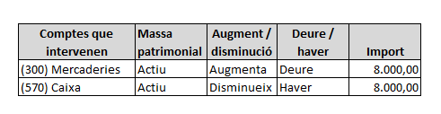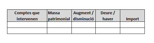 | Element patrimonial | Actiu/passiu/net | Increment/disminució | Deure/haver | Càrrec/abonament | Import |