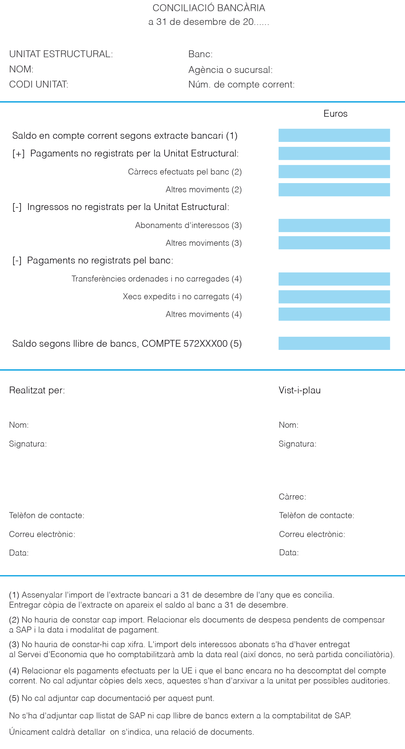 Aquest procés es recull en un document on queden reflectits, d’una banda els saldos dels extractes bancaris i, de l’altra, el saldo del compte 572. Bancs, c/c, a més de relacionar aquelles operacions que en justifiquen les possibles diferències.