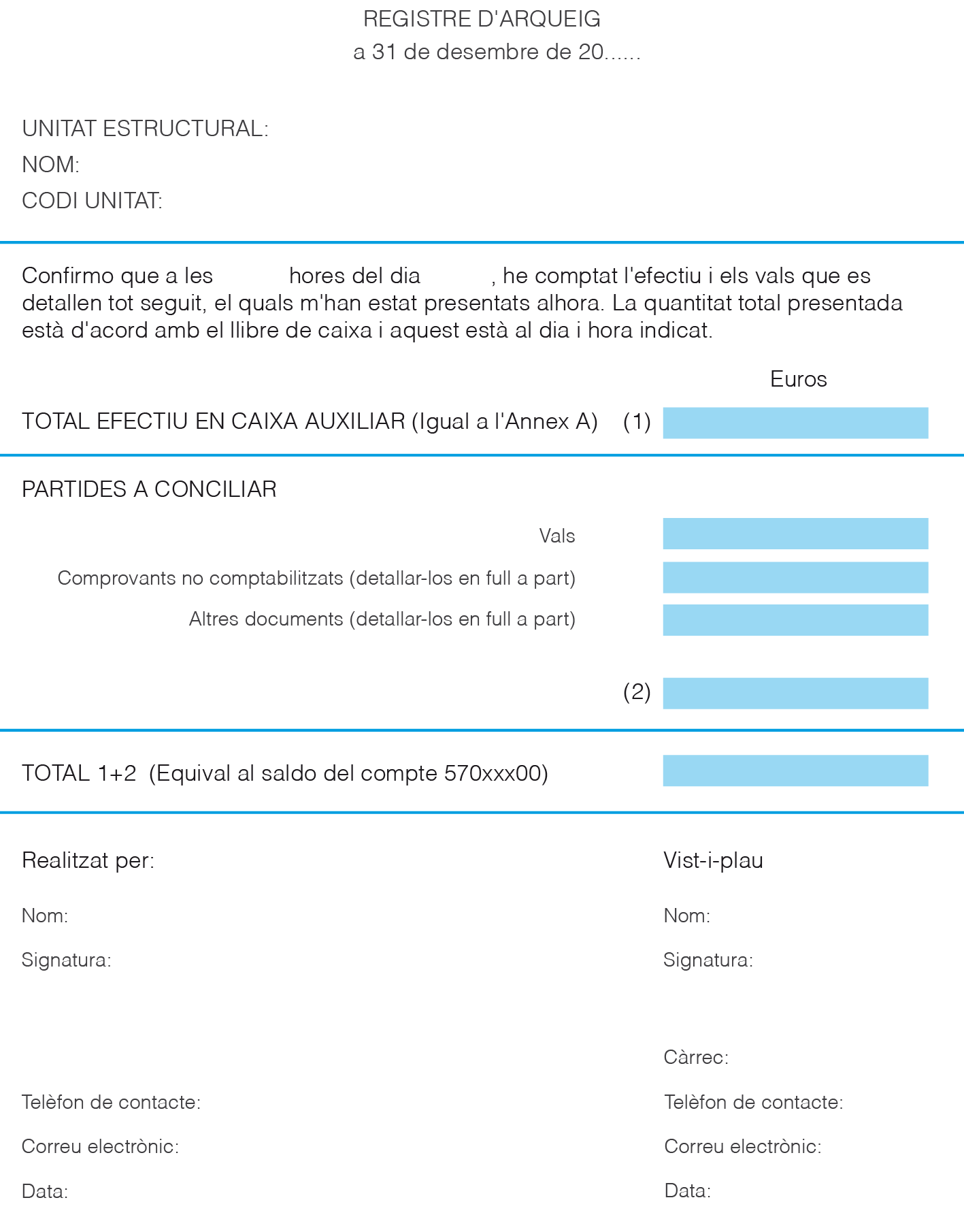 Els documents de conciliació i arqueig s’han d’arxivar de forma permanent. No existeix cap model normalitzat. Cada empresa pot adaptar el format a les seves necessitats.