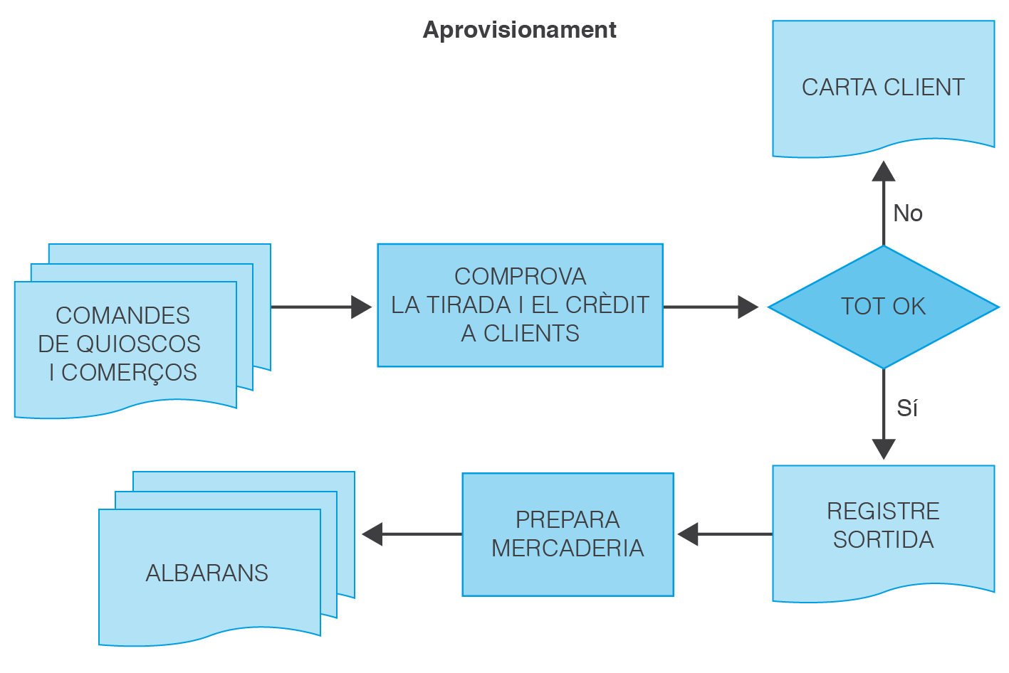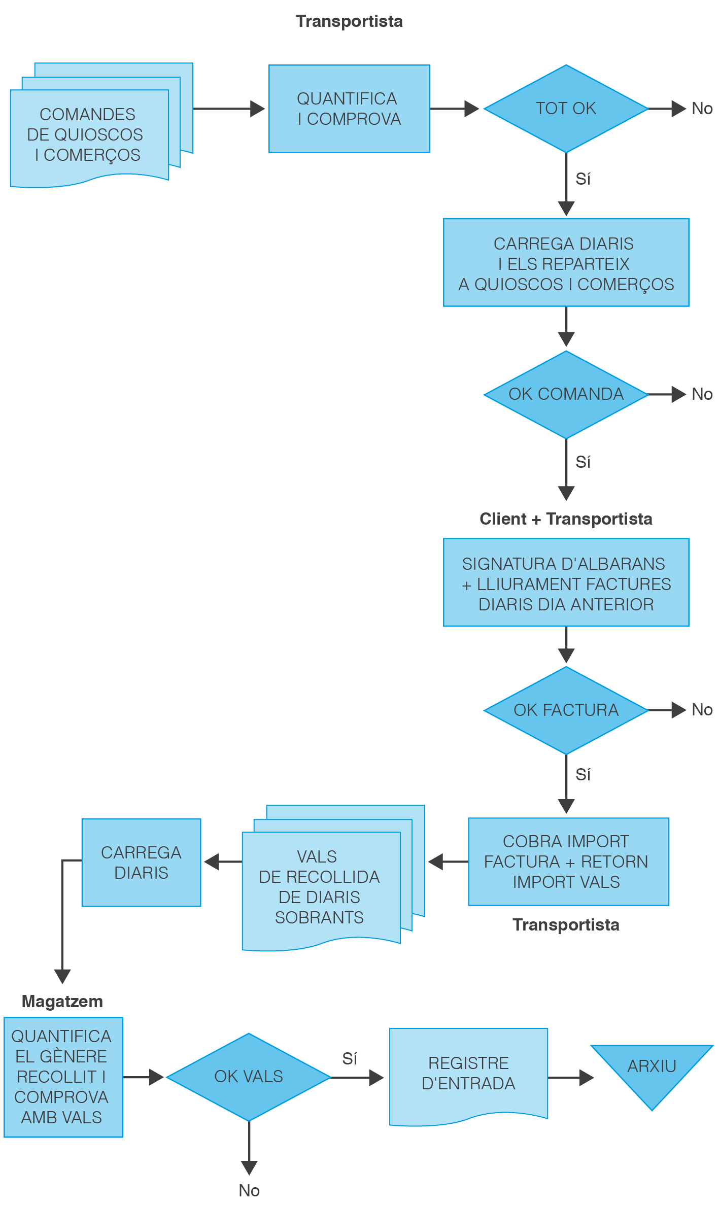 Elaboreu el diagrama de flux corresponent a cadascun dels procediments anteriors: recollida dels diaris, lliurament als quioscos i comerços, cobrament dels diaris venuts el dia anterior i recollida del material sobrant per posterior retorn a l’editorial.